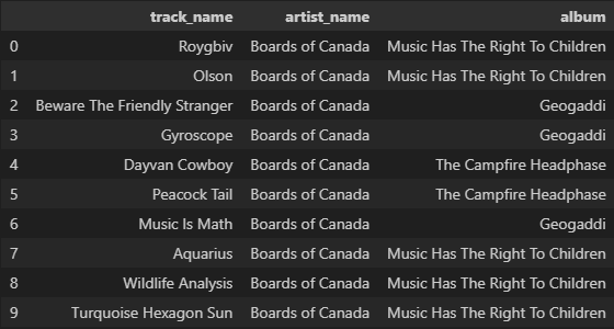 Returns list[dict] with keys: track_name, artist_name, album, popularity, track_id