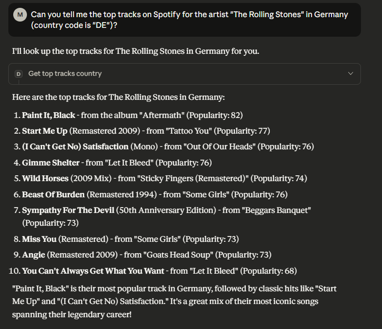 I am using the FastMCP library to make the code from above work in a MCP server framework. The line mcp = FastMCP(“Spotify Top Tracks”) defines the server and tools can be provided by writing @mcp.tool(), followed by a function (see code below). For the MCP server, I have adjusted the code slightly to avoid problem with authentification (I dont want the browser popping up and asking for Spotify username and password). Also, I am mapping country names to country codes. You might prompt “What are the top tracks for The Rolling Stones in Germany?”. Then, “Germany” needs to be mapped to its country code “DE in order to call the function correctly. Finally, my function does not return a pandas dataframe anymore but a dictionary. This is easier to process for the AI. Please note docstrings (the description of the function) are very important as the AI uses them as guidance. guidance. The clearer and more detailed the docstrings are, the better the model can reason about when and how to call the function.