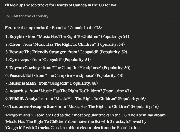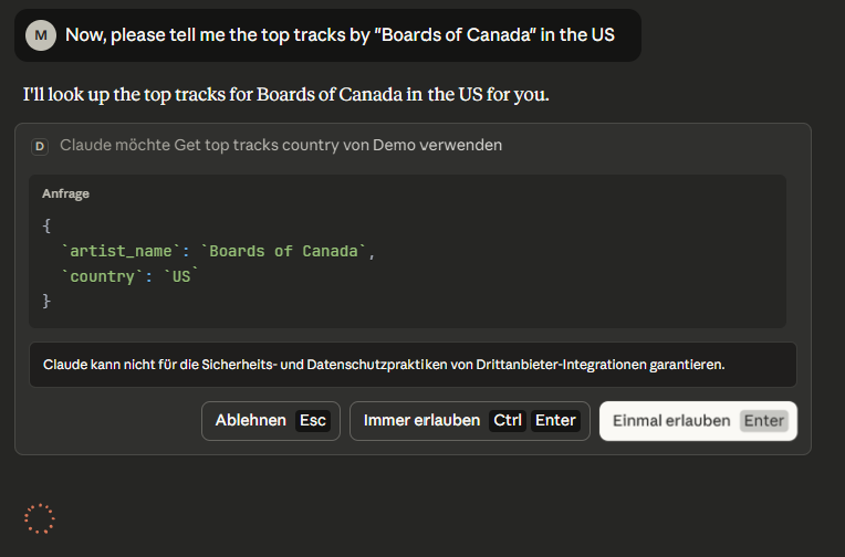 When asking Claude about top tracks by an artist in a given country, it recognizes that there is a tool for it (the MCP server). It will ask you then whether you would like to use it. After approval, it will use the tool and report its result back to you.