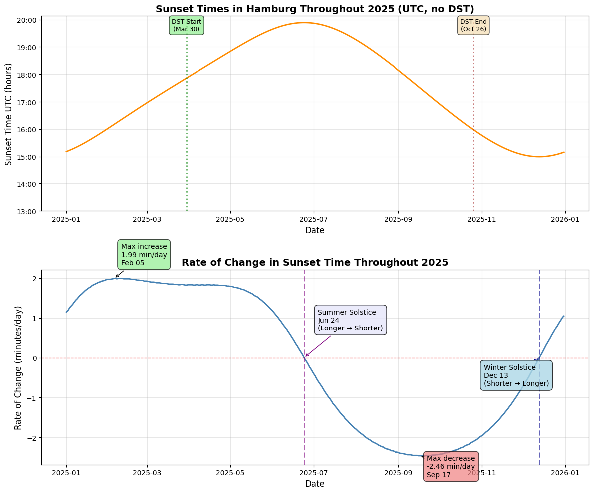Unlike weather forecasts, sunset times are not predictions. Instead, they can be calculated precisely from astronomical principles, taking into account latitude, longitude, and the Earth’s tilt (see https://gml.noaa.gov/grad/solcalc/calcdetails.html). Another challenge in analyzing daylight is time changes due to Daylight Saving Time (DST). When clocks shift forward in spring or backward in autumn, the local sunset time can jump by an hour overnight. While this affects our clocks, the astronomical sunset continues on its precise schedule. To avoid the sudden jump in sunset time, I used Coordinated Universal Time (UTC) and then converted it to local time.